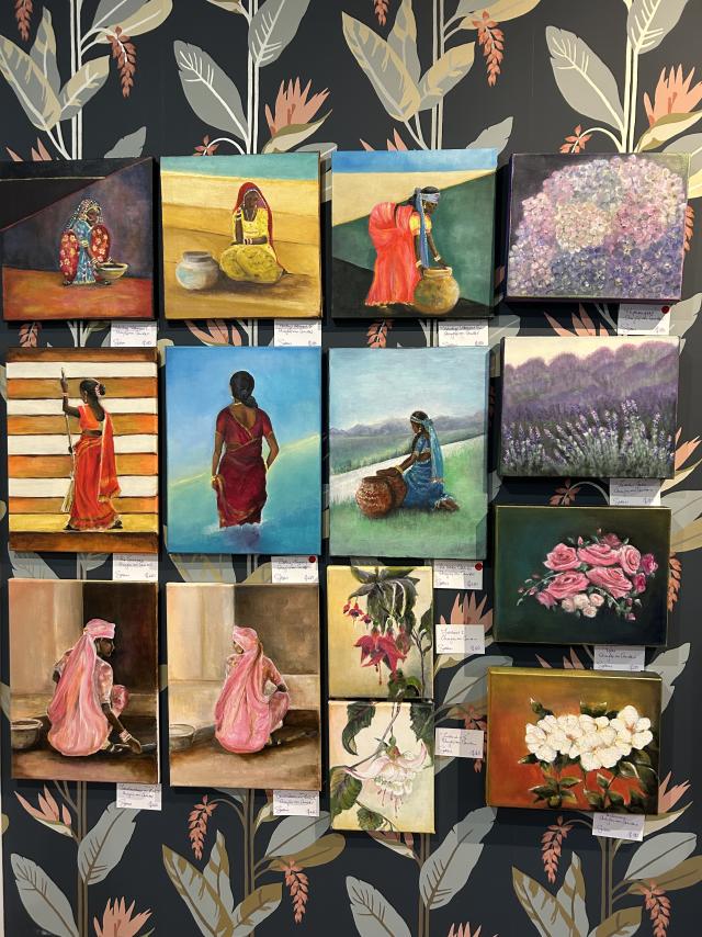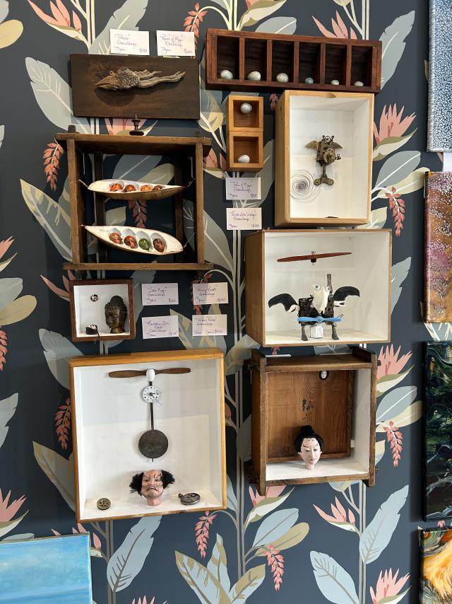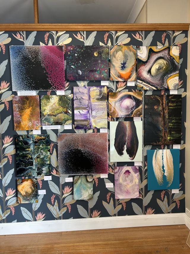 The exhibition features an array of styles and mediums, including Ms Mcooey’s acrylic paintings reproduced as prints from her time in India; Ms Rogers’ abstract resin and acrylic works; Ms McGill’s imaginative 3D ‘assemblages’; and Ms Donald’s vibrant knitting and weaving pieces.