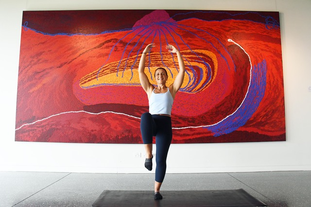 The Gallery of Art provides a perfect and peaceful backdrop for a pilates session, with the sweeping green vista on full display through large windows and incredible Indigenous art surrounding the walls inside.